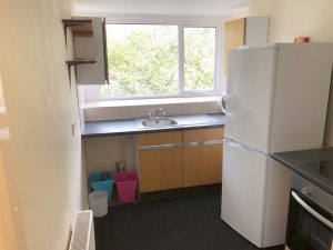 - Appliances: Fridge-freezer, Oven, Microwave, Washing machine, Waste bin, Hob